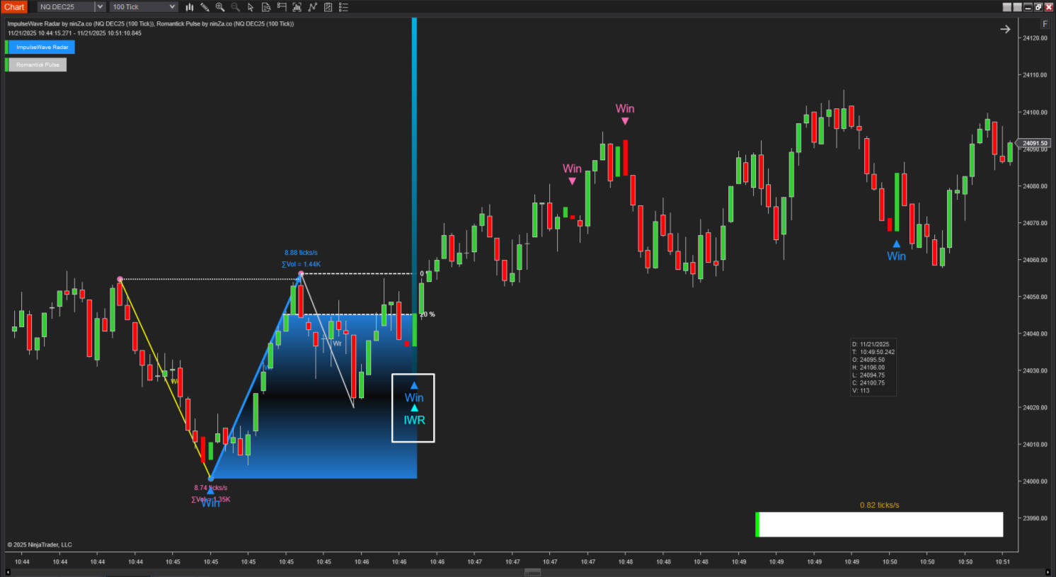 Dynamic 3-Wave AnalyzerImpulseWave Radar uses the Dynamic 3-Wave Analyzer mechanism, analyzing three consecutive waves (W0 → WI → WR) and confirming that the impulse wave (WI) has stronger momentum than the base wave (W0) using ticks-per-second.This ensures only high-quality signals are triggered, while the real-time momentum gauge tracks price speed, confirming strong trends and filtering out weak setups.Click here to learn more about ImpulseWave Radar ↓
